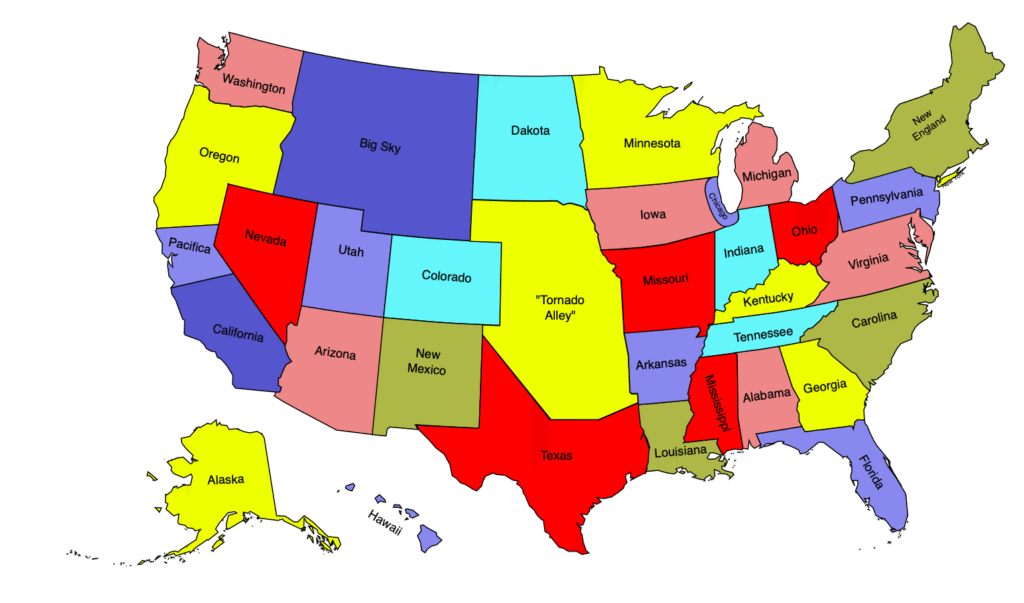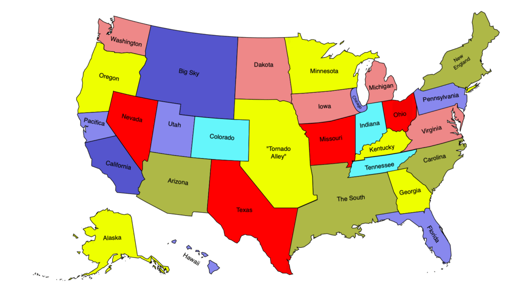 Kansas, Nebraska, Oklahoma, and the northern part of Texas shall be a single state known as Tornado Alley until a proper, permanent name is selected by referendum. The tight concentration of schools with Division 1 football programs might necessitate this state getting its own college sports conference. In the interest of freedom and shared responsibliity, the capital will be based in a mobile home, which will move whenever a nearby tornado picks it up and throws it elsewhere. The economic capital will be the Dallas-Fort Worth Metroplex, of course. According to politician, comedian, and notable Texan Kinky Friedman, “real Texans” don’t consider Dallas part of Texas anyway.